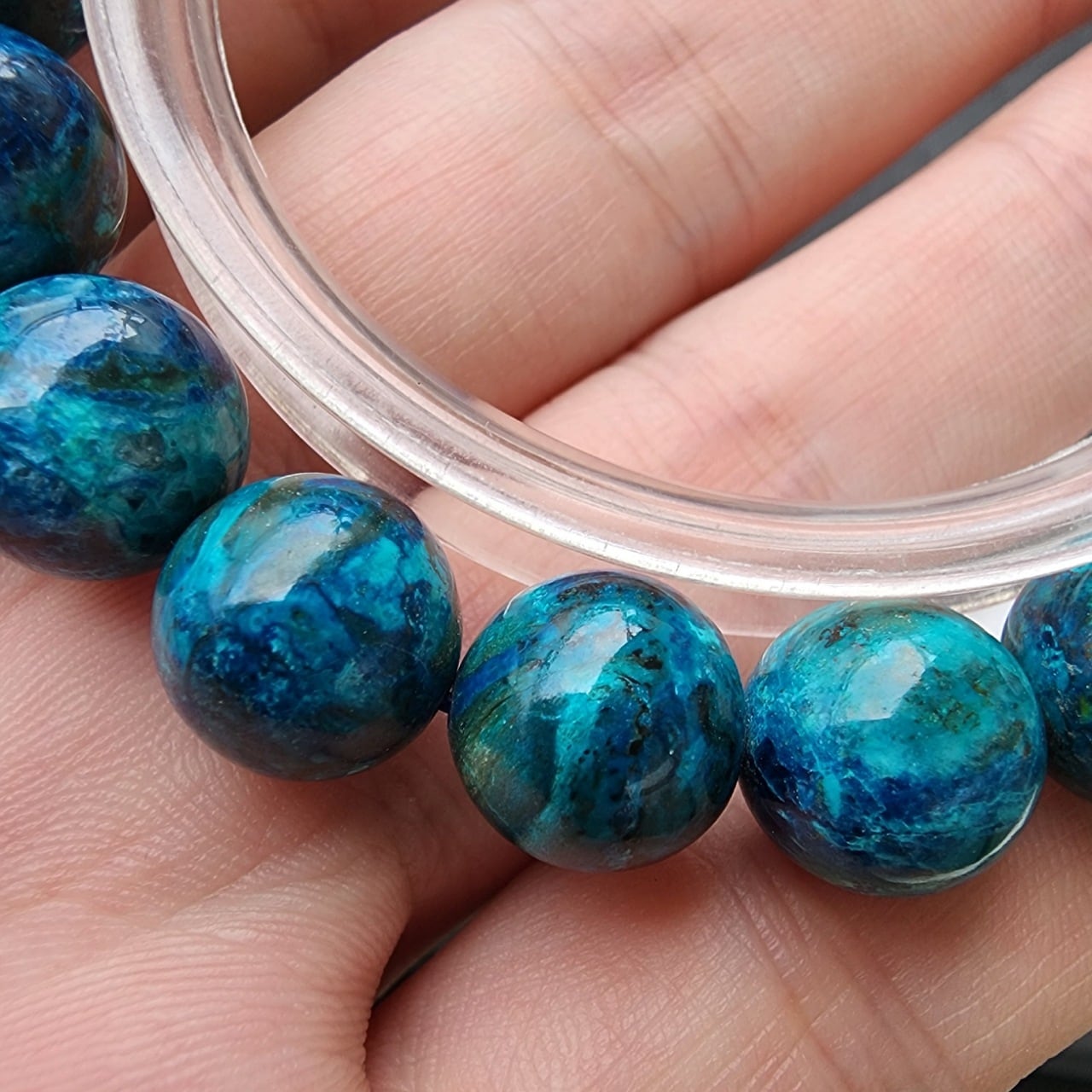単独でなくマラカイトやアズライトなど他の銅関連鉱物と混じり合って産出され、青色や青緑色の美しい縞模様を持つのが特徴です。