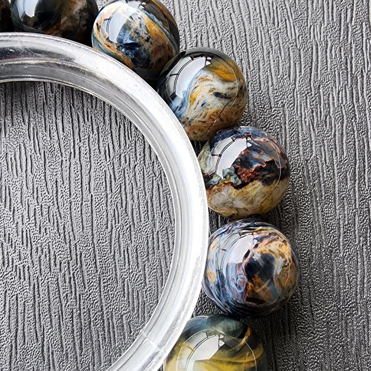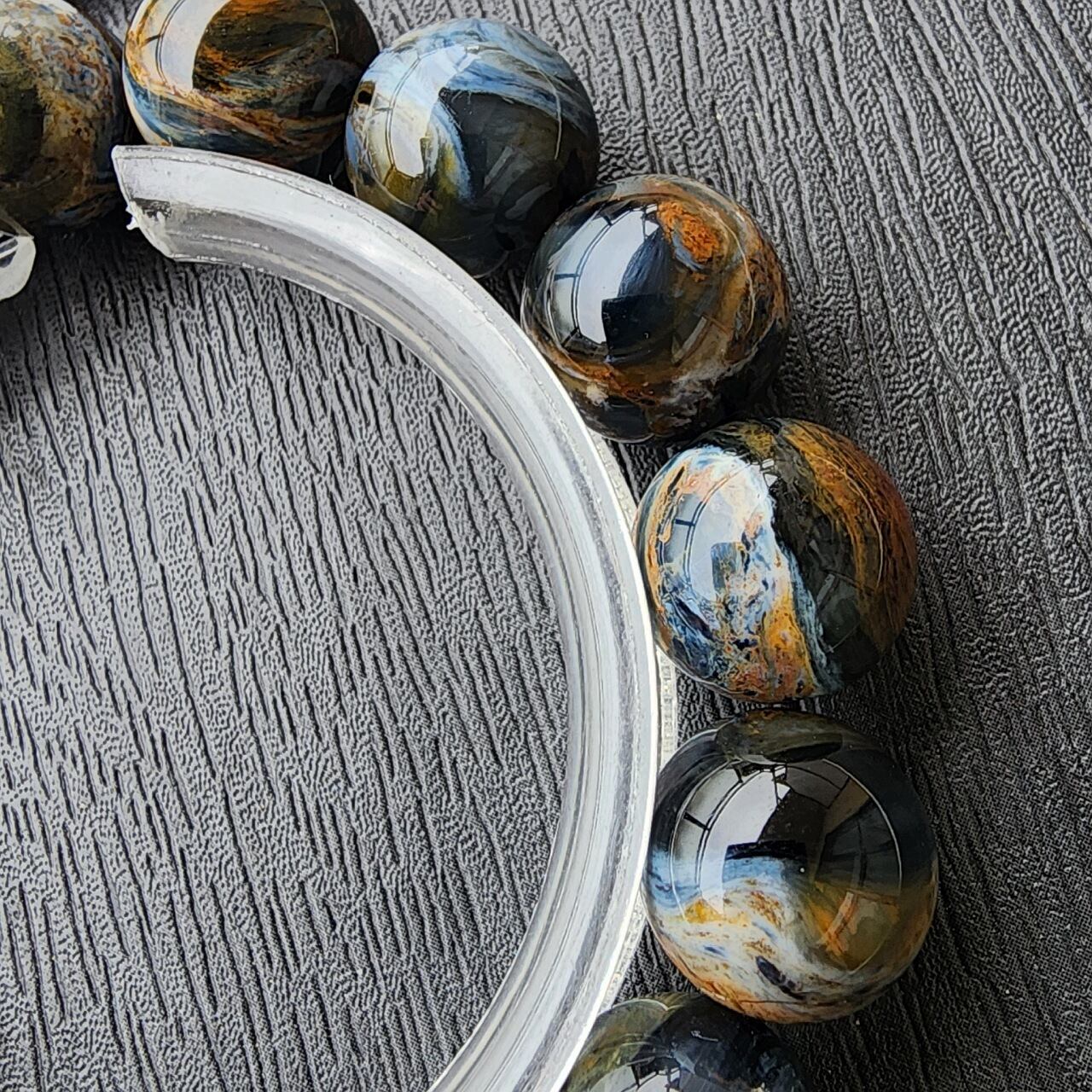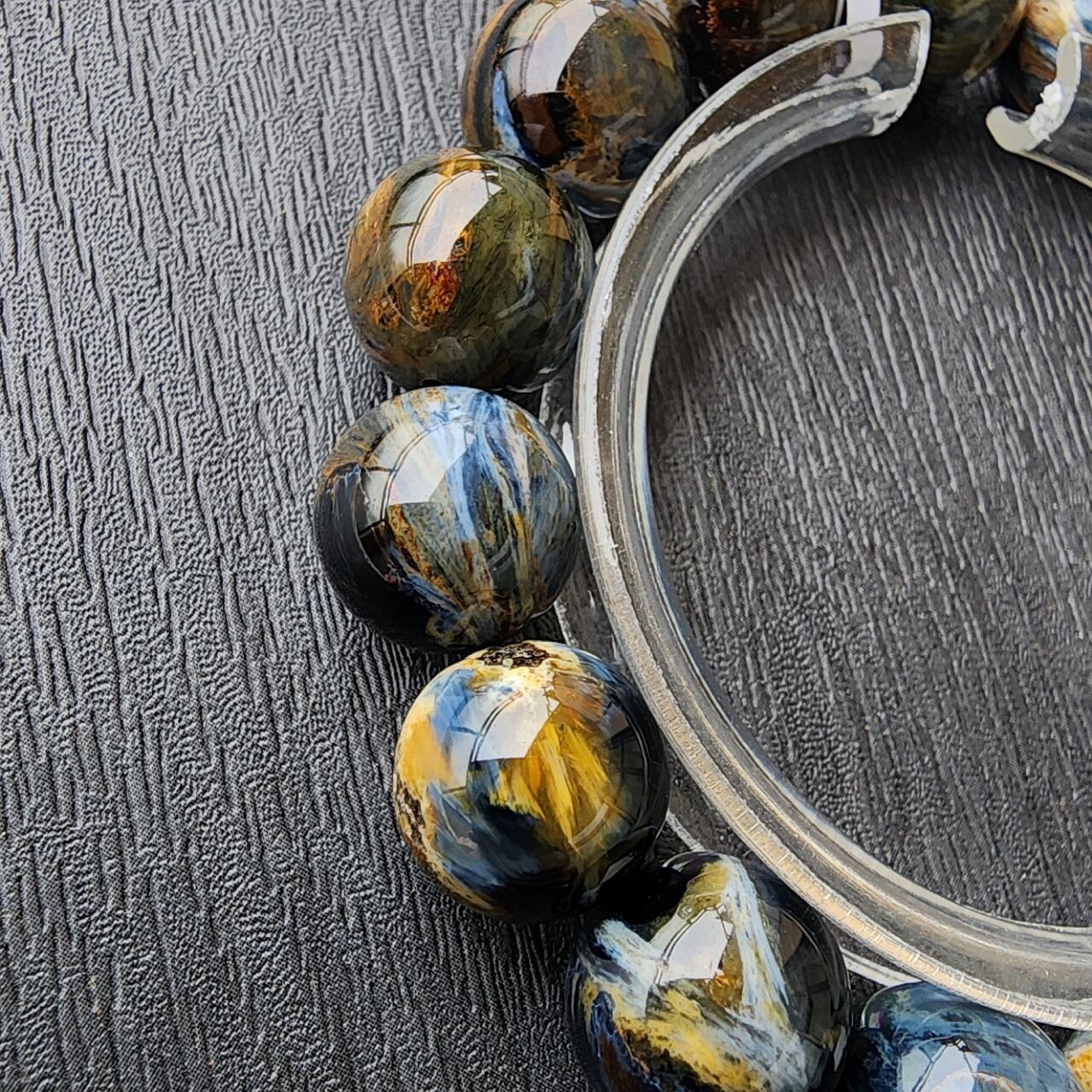 ピーターサイトとは、タイガーアイ(虎目石)やホークスアイ(鷹目石)が地殻変動で砕かれ、石英(クォーツ)が浸透して再結晶した天然石で、「テンペストストーン(嵐の石)」とも呼ばれ、油絵のような渦巻く模様と光の反射による輝き(シャトヤンシー)が特徴のとても美しい天然石になります。