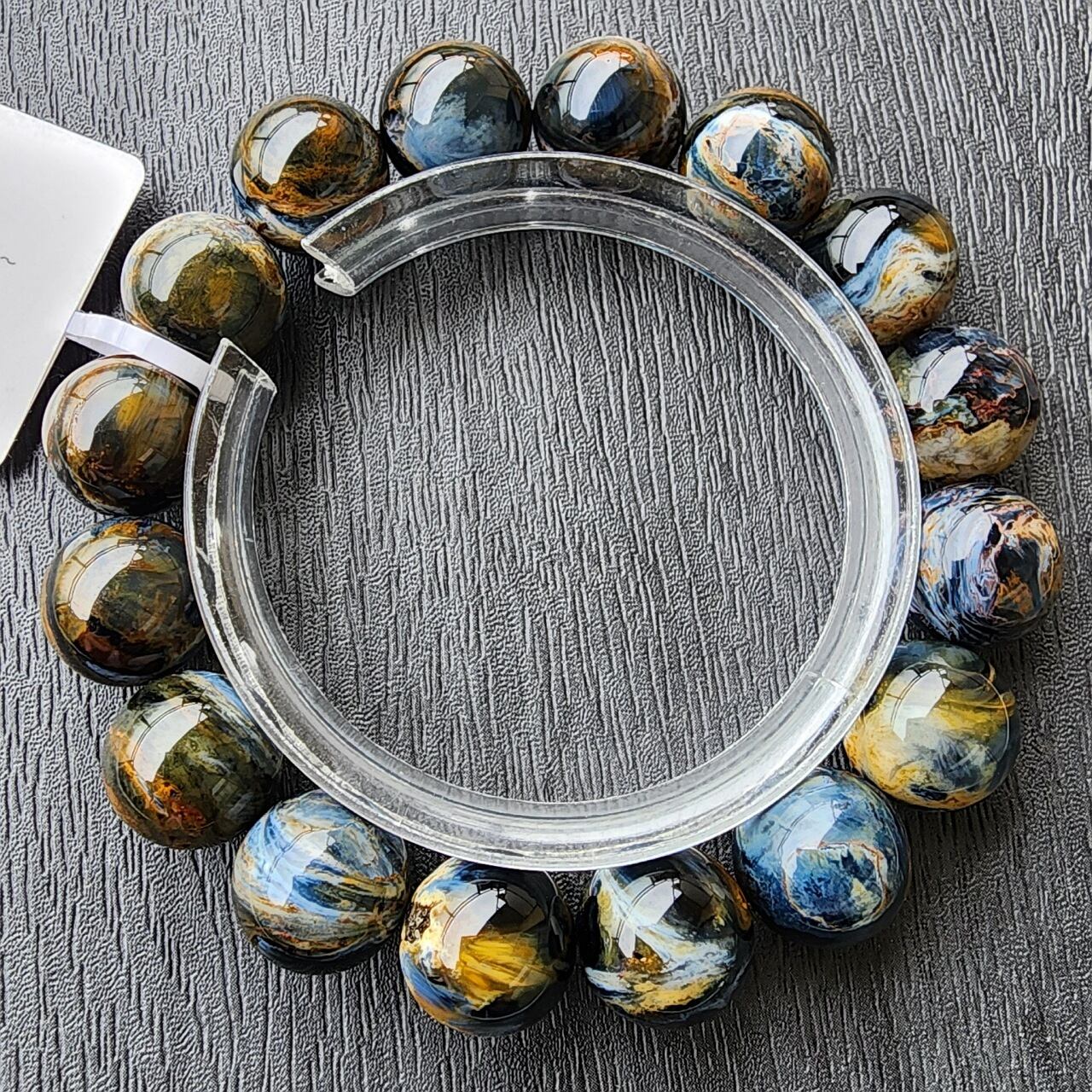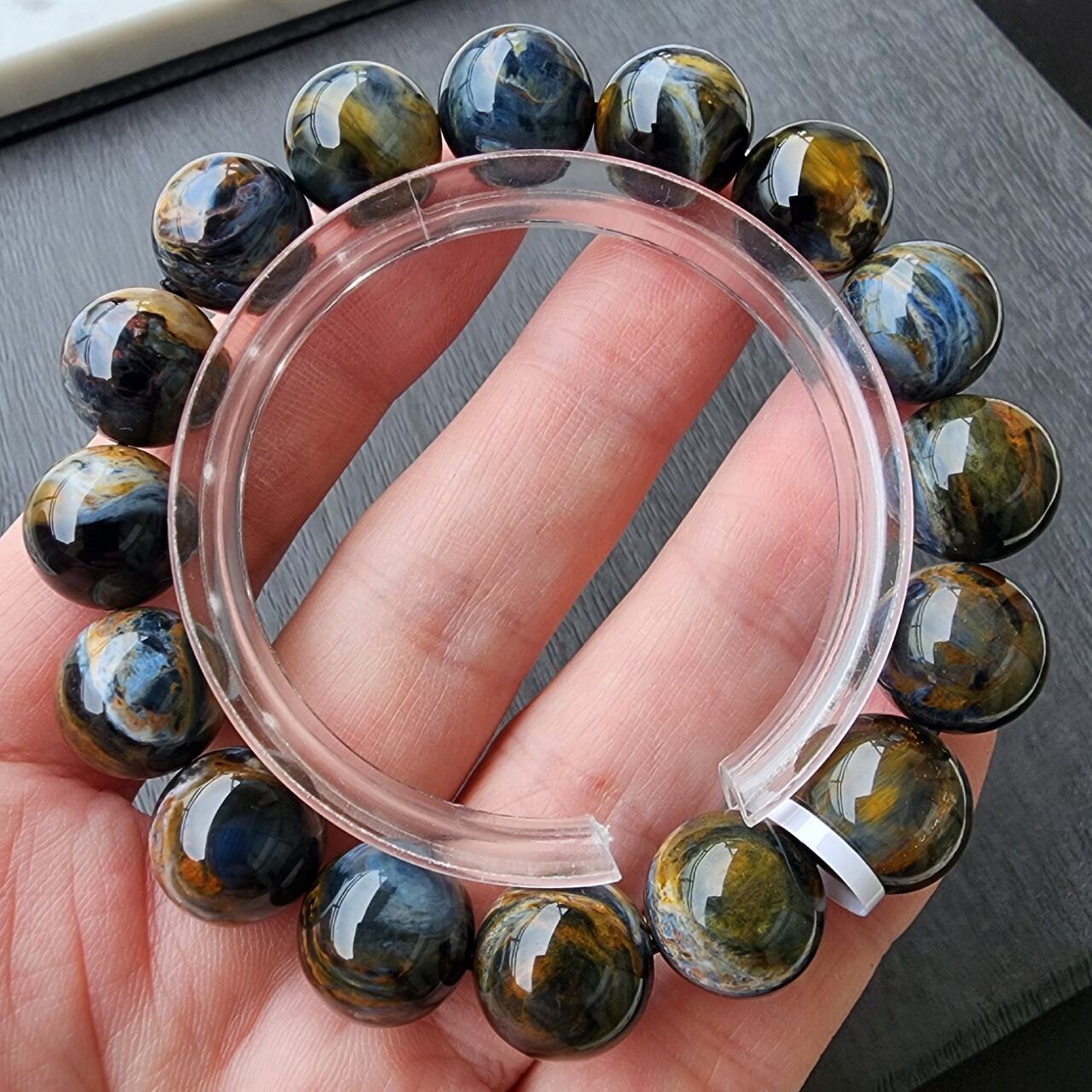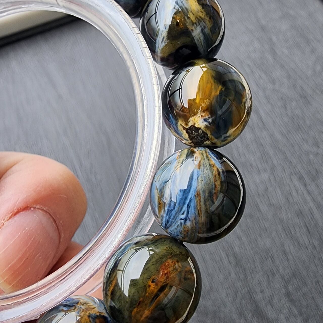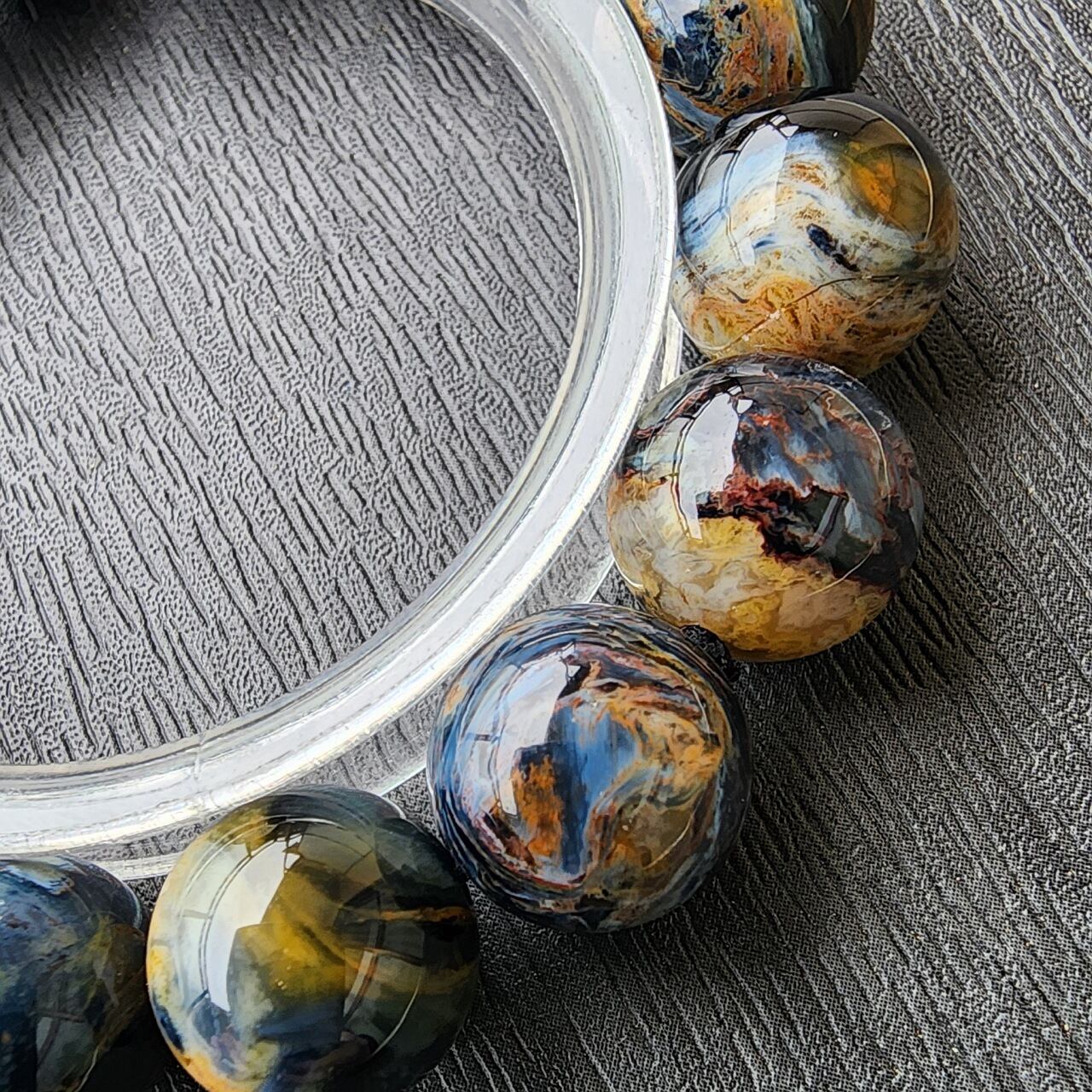 ピーターサイトとは、タイガーアイ(虎目石)やホークスアイ(鷹目石)が地殻変動で砕かれ、石英(クォーツ)が浸透して再結晶した天然石で、「テンペストストーン(嵐の石)」とも呼ばれ、油絵のような渦巻く模様と光の反射による輝き(シャトヤンシー)が特徴のとても美しい天然石になります。