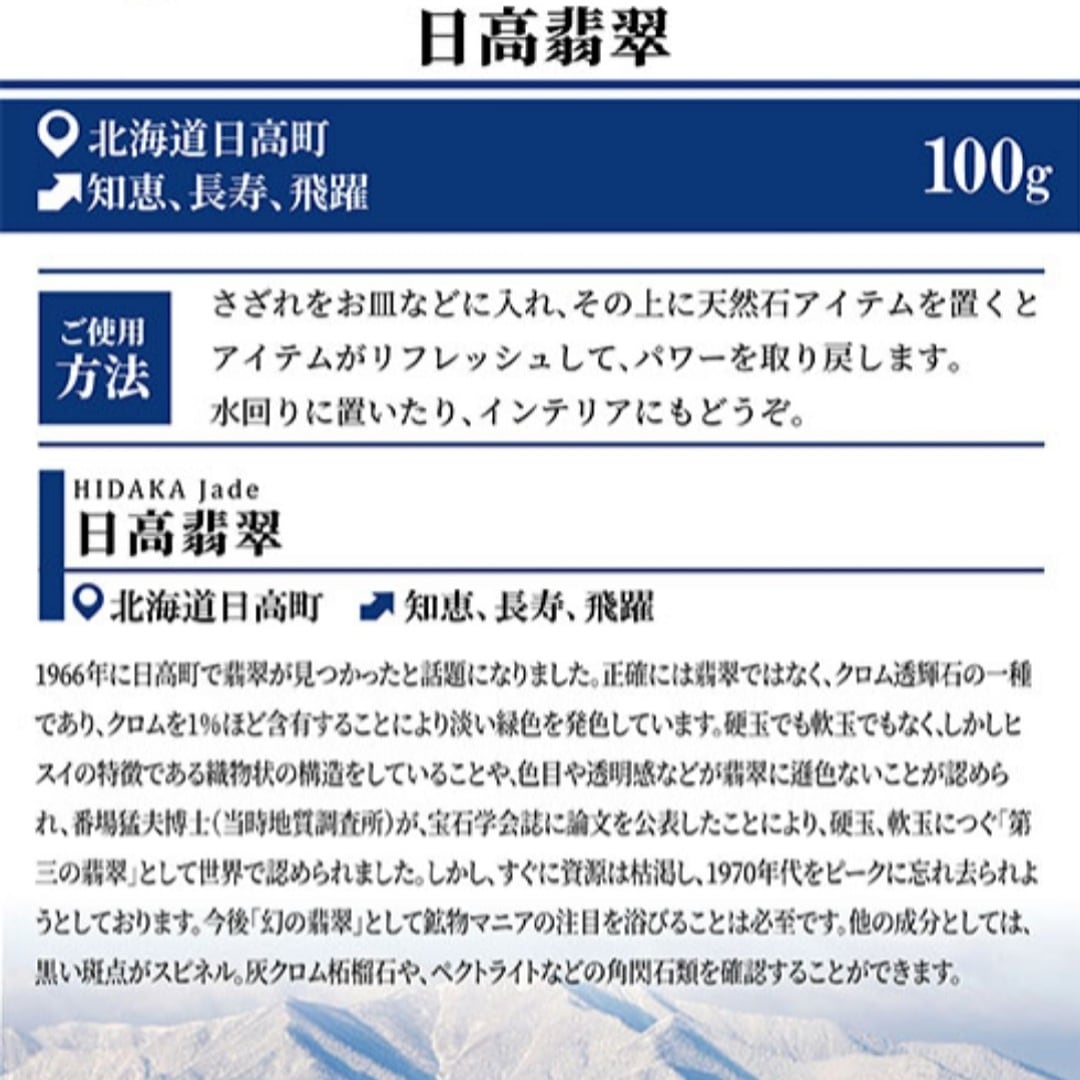 【天然石】【日本銘石】【さざれ】 ●1袋100gの価格になります。ご希望の袋数をご入力の上ご購入下さい。 ●配信値引き対象外商品になります。 商品内容 ●北海道産 日高翡翠 さざれ100g (中粒~大粒)